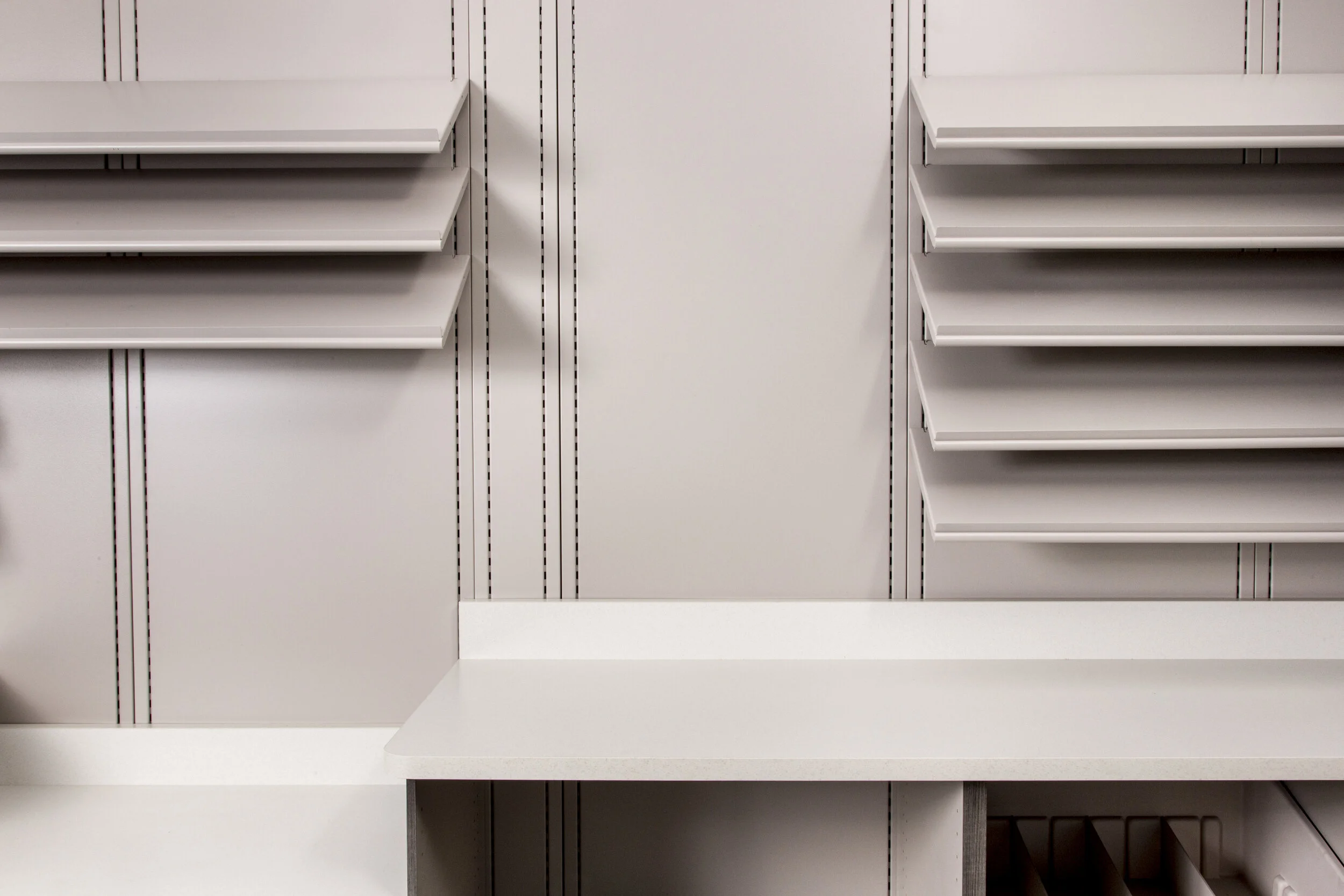 Liberty Workspaces (formally Lionville Fixtures) is the only manufacturer in the pharmacy industry creating modular casework utilizing metal components. Our robust back-panels are 18-gauge steel and allow items like cabinets or overhead pharmacy shelving to be mounted without drilling into existing walls. Liberty’s overhead steel shelves are endlessly versatile, featuring adjustability with a pull of a pin.